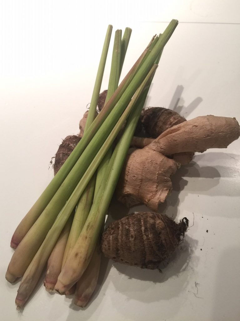 Stalks of fresh lemongrass, ginger and taro root