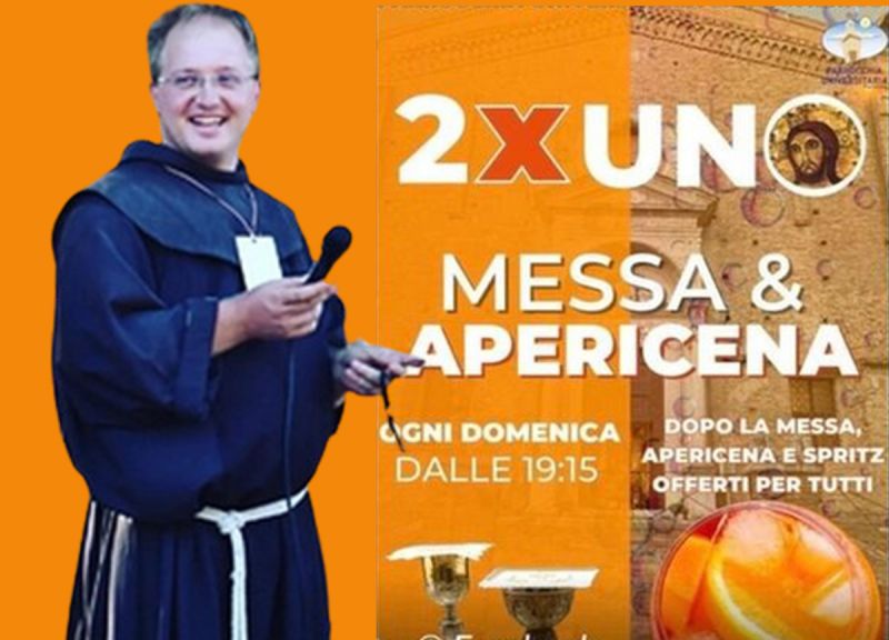 The initiative, dubbed “Messa and Apericena,” was publicized through a poster displayed outside the university parish of San Domenico. The poster juxtaposed images of Jesus and Holy Communion with a glass of spritz, a move that quickly drew ire from some local residents and churchgoers.