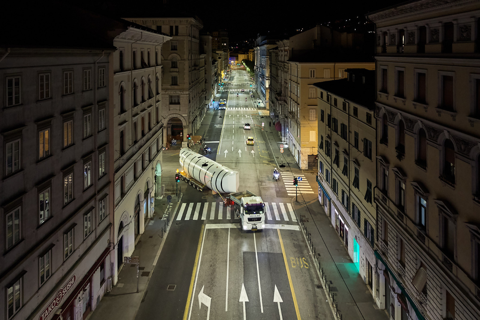 The slow procession wound its way through some of Trieste’s most central streets — Riva 3 Novembre, Piazza della Borsa, Corso Italia, and Largo Barriera — before arriving at the museum grounds on Via Cumano. The nocturnal move was designed to minimize disruption in the city center.