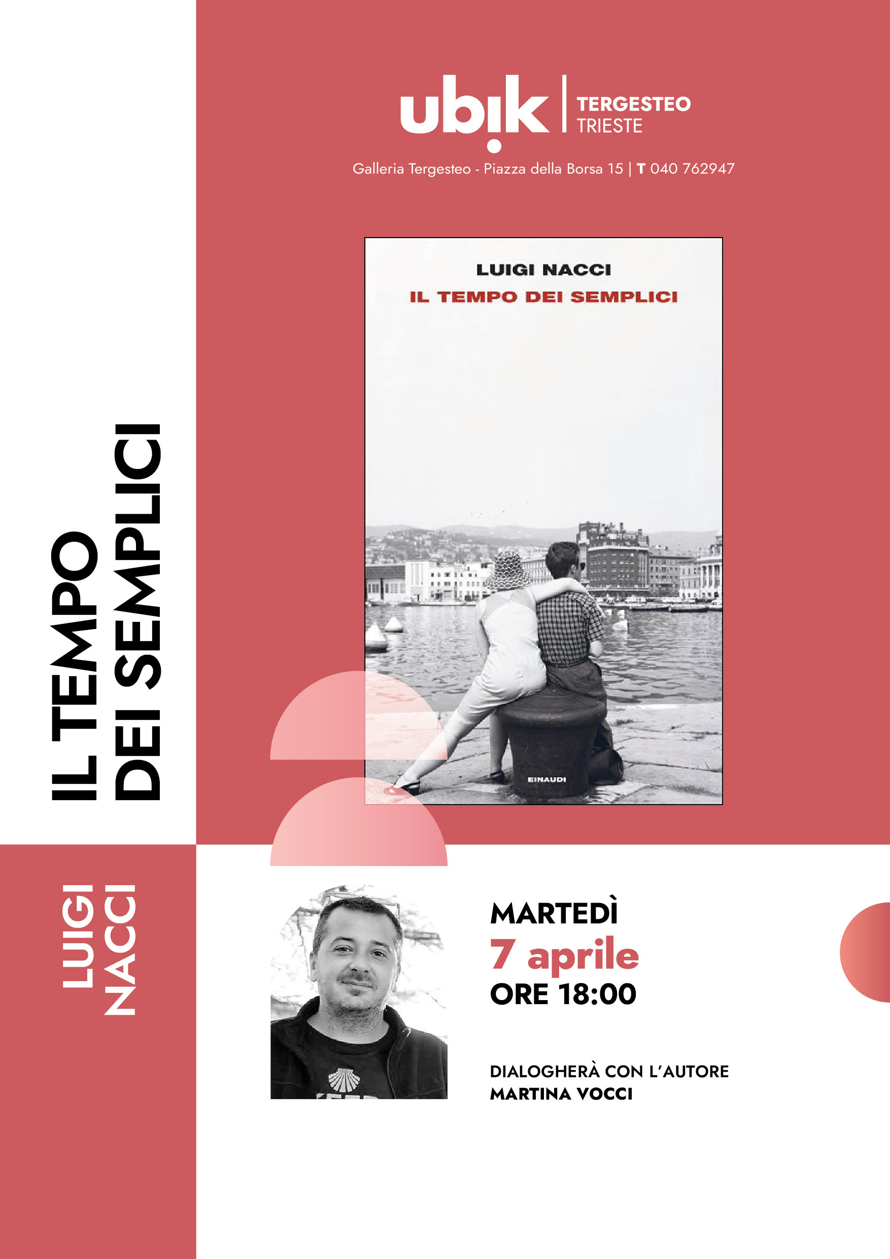 Luigi Nacci will present his latest novel, Il tempo dei semplici (Einaudi), on Tuesday, April 7 at 6 p.m. at the Ubik bookstore in Trieste’s Galleria Tergesteo. Journalist Martina Vocci will join him for a conversation.