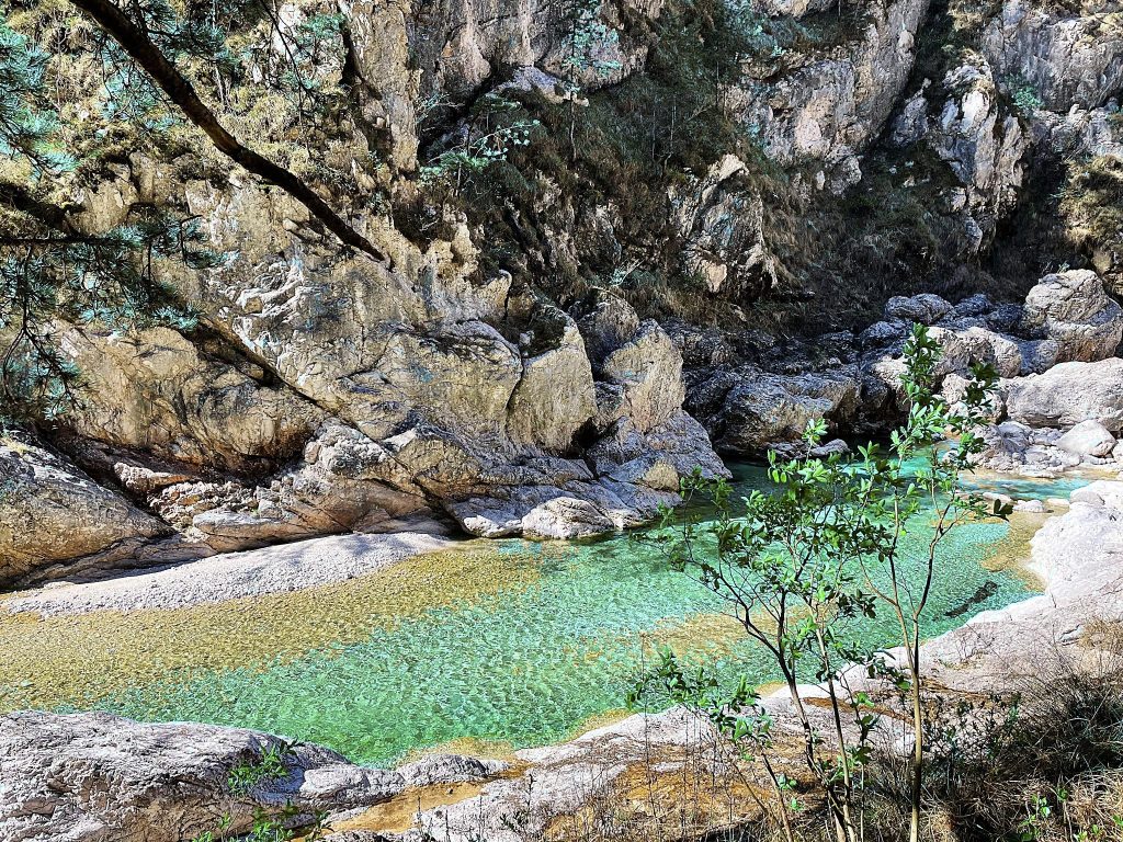 Reaching Stavoli is not just travel—it is pilgrimage. The journey begins in the village of Campiolo, past Moggio Udinese, where visitors must leave their car in the parking lot at the beginning of the narrow mountain road. From here, between the houses of Campiolo, a footpath, Sentiero CAI 417, descends toward the emerald waters of the Glagnò river, whose steady flow accompanies the first part of the hike. It is a breathtaking part of the journey, the emerald pools below beckoning to you, and, like sirens, inviting you to touch the cold, irresistible waters.